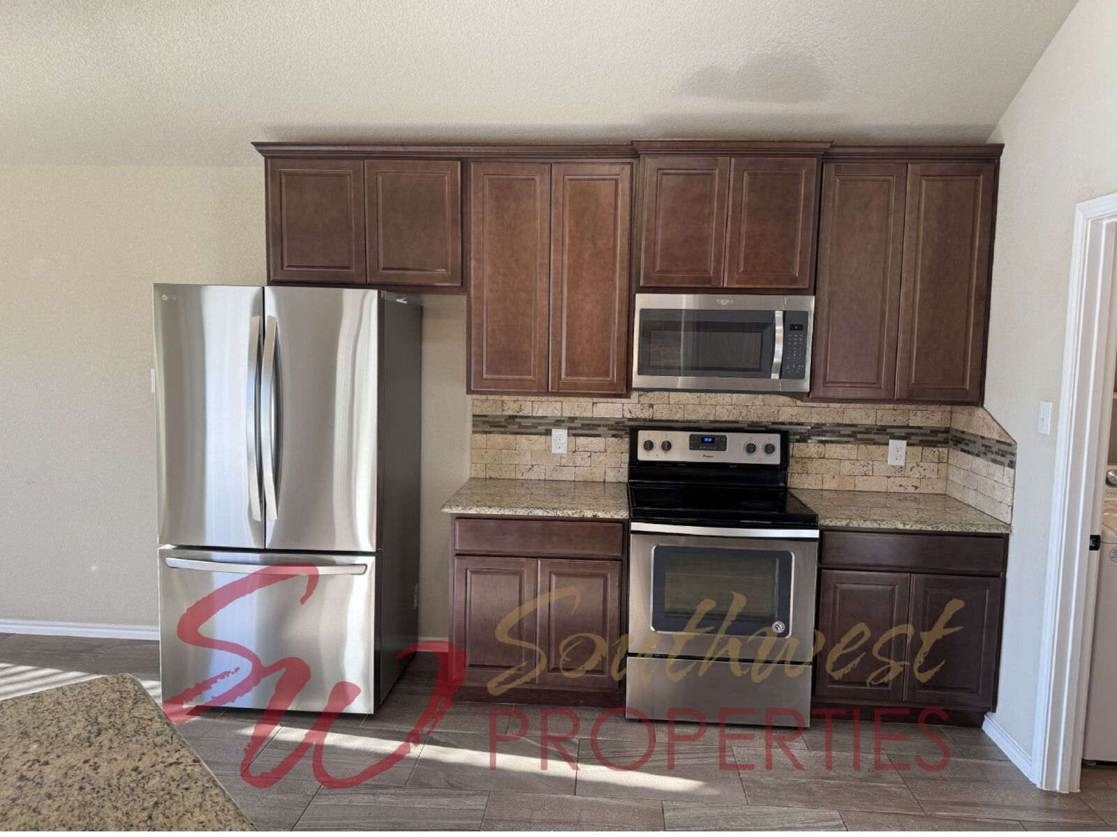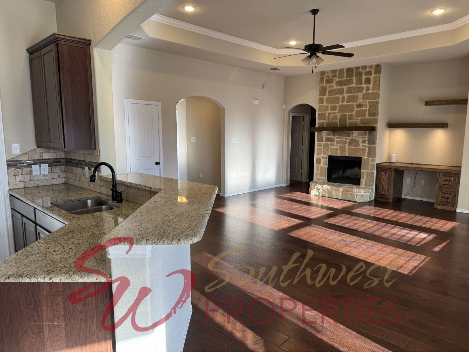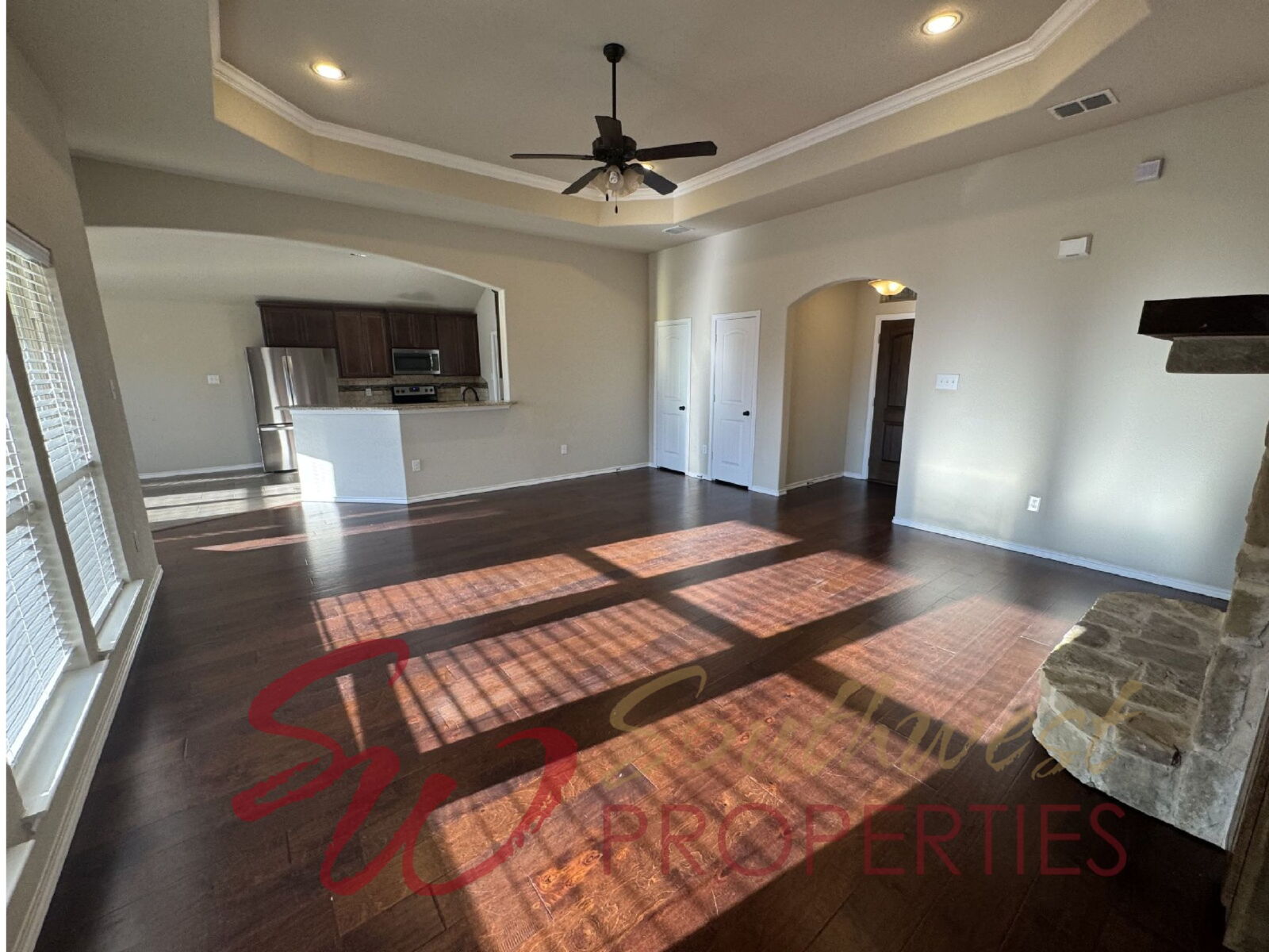 Step inside to a warm and inviting open-concept kitchen and living area filled with natural light from many windows throughout. The spacious living room features: